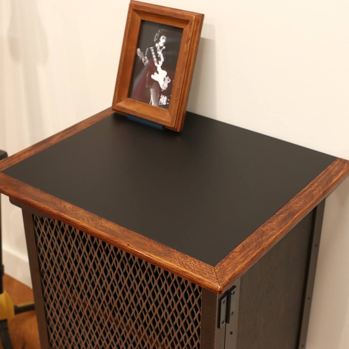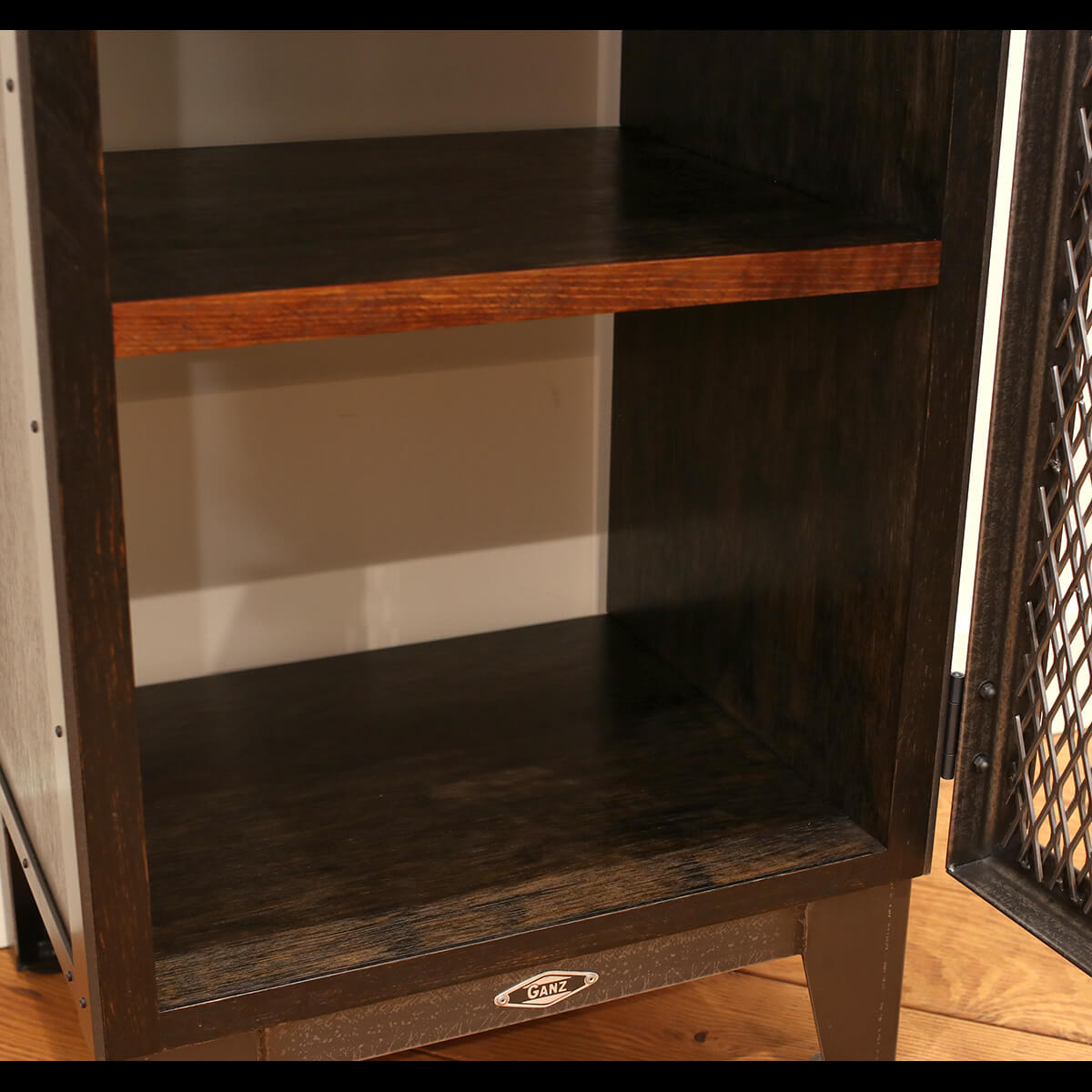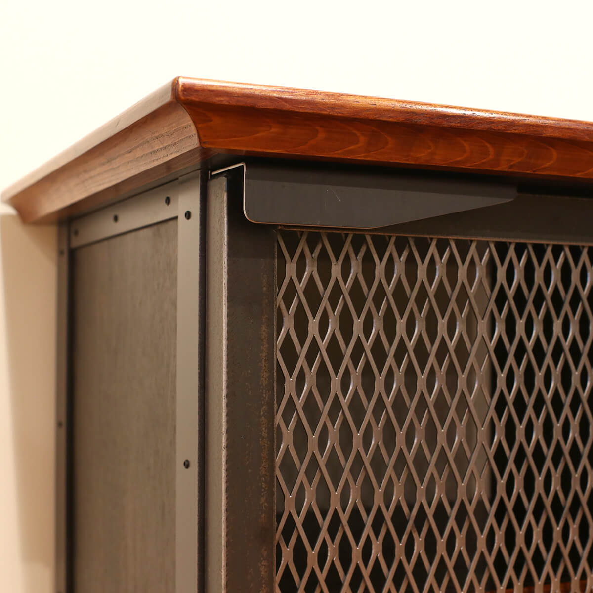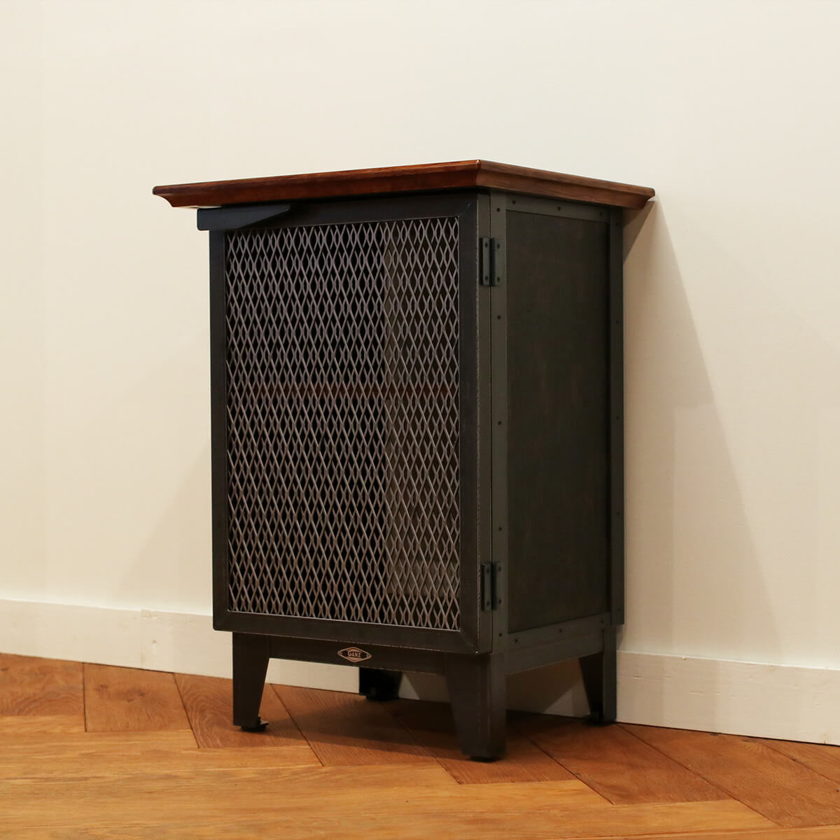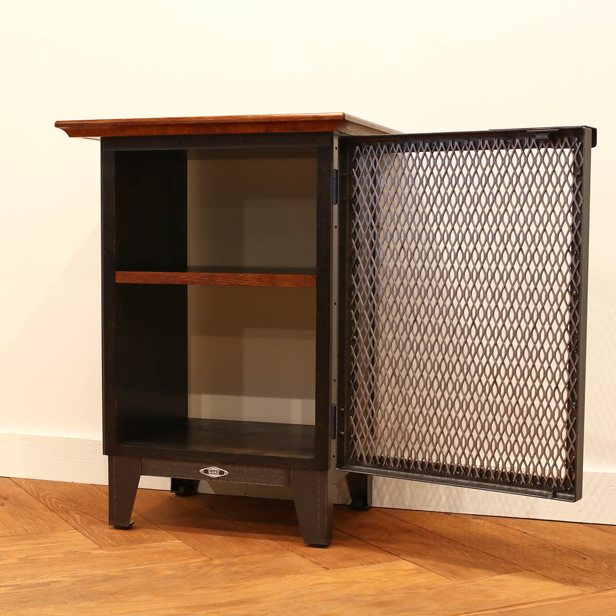 メッシュ扉の小型キャビネット(ウッドアンドスチール)のオーダー制作例です。
