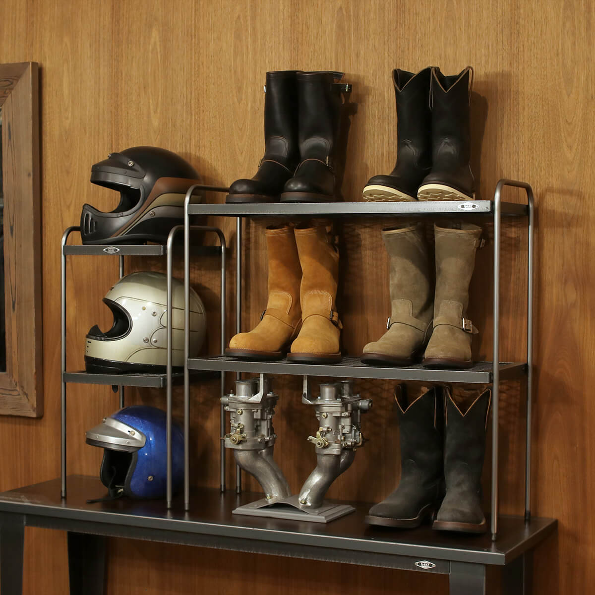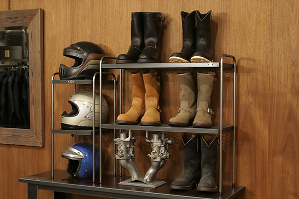 エンジニアブーツなどを最大9足ディスプレイ(収納)できて、インテリアとしてバランスよくまとまるサイズ感に仕上げています。